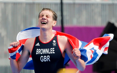 Britain's Alistair Brownlee celebrates after winning in the men's triathlon final during the London 2012 Olympic Games at Hyde Park on Tuesday. (REUTERS)