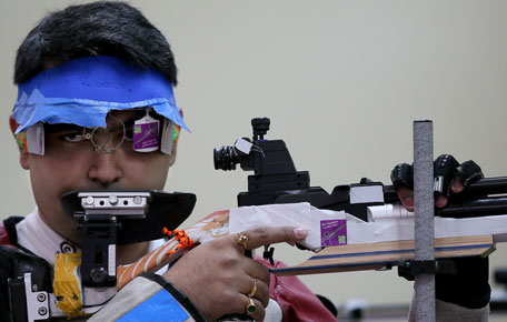 India's Gagan Narang competes in the 10m air rifle men qualifying round at the Royal Artillery Barracks in London on July 29, 2012 during the London 2012 Olympic Games. (AFP)