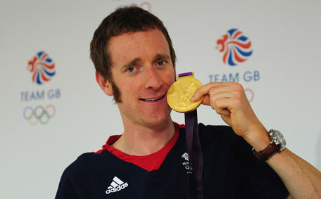 Team GB Cycling Time Trial Gold medallist Bradley Wiggins poses with his gold medal at GB House in Stratford on Wednesday in London, England. (GETTY)