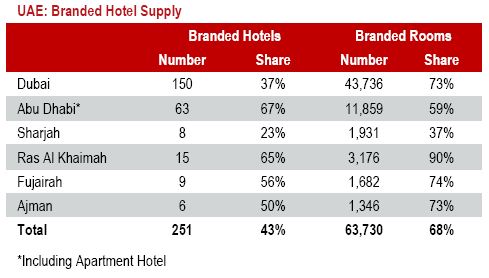 The UAE houses 590 hotels totalling more than 93,000 rooms at the end of 2013. International operators hold about 68 per cent of the total hotel room inventory and the majority of the supply is concentrated in the upscale 4- and 5-star segment. Dubai and Abu Dhabi account for 68 per cent of the hotel supply in the UAE.