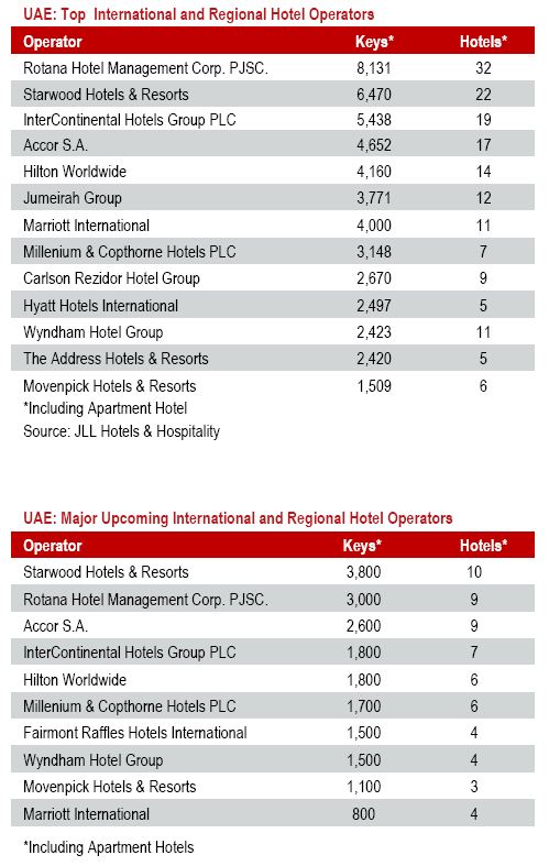 Currently, Abu Dhabi-based Rotana Hotels leads the UAE market with 32 properties and 8,131 keys, followed by Starwood Hotels and Resorts with 22 properties and 6,470 keys.