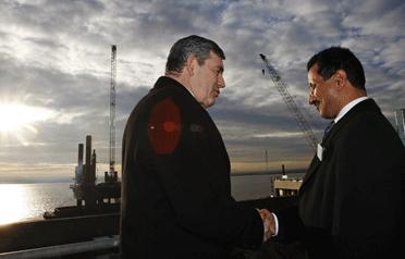 Britain's Prime Minister Gordon Brown shakes hands with DP World chairman Sultan Ahmed Bin Sulayem during a visit to the DP World London Gateway port construction site at Standford-le-Hope near Thurrock in south-east England. (AFP)