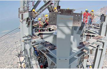 a) Provision of adequate lifting facilities to extreme heights. To overcome this obstacle, we provided three modified Favco luffing tower cranes each with their own hydraulic jumping system. Dedicated rigging teams were employed including the recruitment of skilled experienced personnel who had previously worked with Samsung on the Petronas Tower.