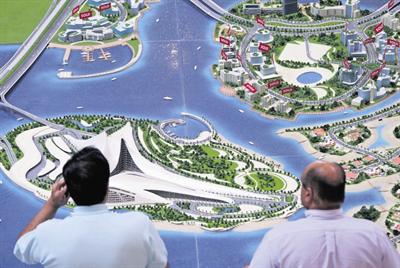 Visitors view a scale model of The Lagoons project, to be built by developer Sama Dubai, at Emirates Towers in Dubai. (PATRICK CASTILLO)