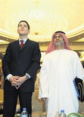 Dr Anwar Gargash with David Miliband at the opening of the summit. (ERIK ARAZAS)