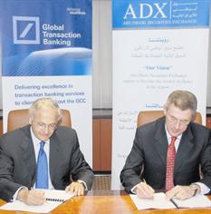 The Abu Dhabi Securities Exchange (ADX) yesterday signed a custody agreement with Deutsche Bank as the burgeoning bourse pushes ahead with an ambitious plan to become a key global stock exchange.