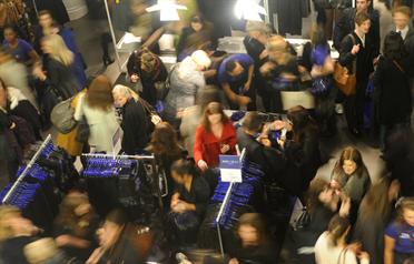 Shoppers gather in front of the H&M fashion store for the launch of Jimmy Choo's exclusive collection for H&M in Lausanne, Switzerland. (AP)