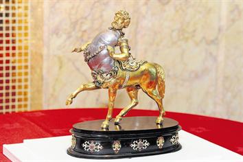 It is a natural salt-water nacreous baroque pearl, four inches in length, with a circumference of six inches and weighs 856.58 carats. The pearl is almost twice as large as the Hope pearl, which is displayed at the British Museum of Natural History, and almost 11 carats heavier than the Burma pearl. It has been incorporated into the design of a stunning sculptural jewel of a Centaur, a Greek mythological creature that was believed to be half man and half horse; the pearl forms the torso of the Centaur, with the remaining parts sculptured in gold.