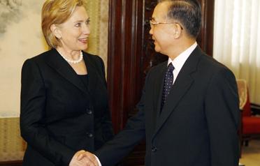 US Secretary of State Hillary Rodham Clinton, left, is greeted by Chinese Premier Wen Jiabao during their meeting in Beijing. (AP)