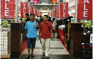 Customers walk near sale banners in a mall in Jakarta, Indonesia. (REUTERS)