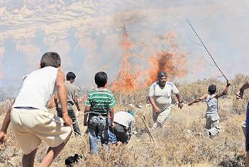 Palestinians try to extinguish fire in a field in the West Bank village of Safa. Global financial aid to Palestine exceeded $2bn in 2008, including about $526m from Arab countries. (AFP)
