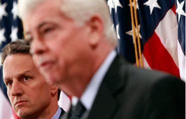 US Treasury Secretary Timothy Geithner (L) listens as Senate Banking Committee Chairman Senator Chris Dodd (R) offers an introduction to details of a financial stability plan at the US Treasury Building in Washington, DC. (AFP)