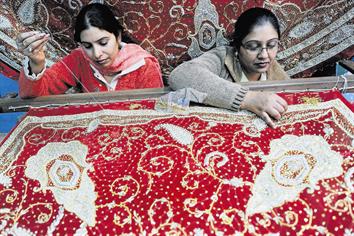 Seamstresses Ranjana Duggal and Komal Kaur embroider a sequinned wedding outfit at a shop in Amritsar. (AFP)