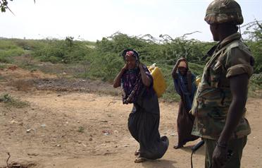 Somali women carry water past a Burundian African Union soldier near their base in the capital Mogadishu. (REUTERS)