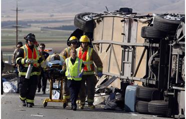 Firefighters transport an injured passenger at the scene of a tour bus crash on Tuesday in Soledad, California, USA. (AP)