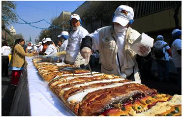 In all, the sweet bread used seven tonnes (6,600 kg) of flour, 3.3 tonnes (3,000 kg) of butter and 396 gallons (1,500 liters) of milk, according to Canaipa head Antonio Arias.