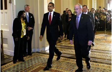 US President Barack Obama escorted by Senate Sergeant-at-Arms Terrance Gainer, heads to a meeting with Senate Republicans after he spoke to the media at the US Capitol in Washington, DC (GETTY IMAGES)
