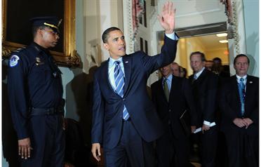 US President-elect Barack Obama (C) waves to reporters as he departs after attending the weekly Senate Democrats luncheon at the US Capitol in Washington, DC. (GETTY IMAGES)