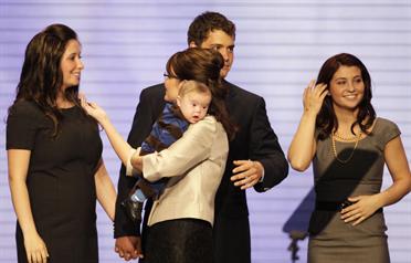 In this file photo, Republican vice presidential candidate Sarah Palin holds son, Trig, as she talks with her daughter, Bristol, after her family joined her on stage after her speech at the Republican National Convention in St. Paul, Minn. At right is daughter, Willow, and in back is Bristol's boyfriend, Levi Johnston. (AP)