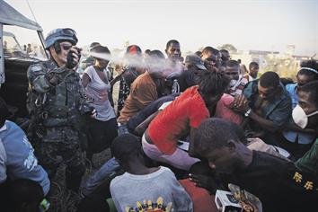 A UN peacekeeper sprays tear gas on Haitians fighting for aid at an old military airfield in Port au Prince (AFP)
