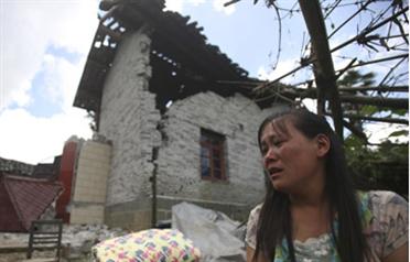A woman cries near her collapsed house following an earthquake in Yingjiang county, Yunnan province in this August 23 file photo. Another major quake hit Sichuan province, killing 22 people. (REUTERS)