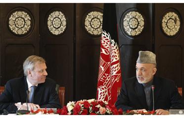 Afghanistan's President Hamid Karzai (R) talks with North Atlantic Council participants as Nato's Secretary General Japp de Hoop Sheffer (L) listens during a meeting in Kabul. (REUTERS)