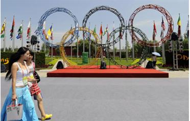 Women walk past the Olympic rings and various national flags of some of the participating countries at the Olympic Village in Beijing, China. (AFP)