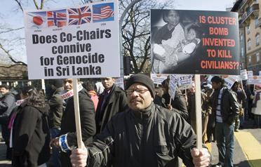 A protestor holds posters during a protest of about 10,000 Tamils participating in a protest against what they call ‘genocide on Tamils’ in Sri Lanka, during a rally in Geneva, Switzerland. (AP)