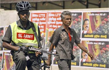 An armed Sri Lankan soldier stands guard in Colombo, Sri Lanka. Posters in Sinhalese congratulating President Mahinda Rajapaksa and the Sri Lankan army for military victories against Tamil rebels are seen in the background. (AP)