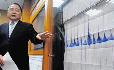 Kuo Kai-wen, Head of Taiwan's Seismology Centre, pointing at seismic graphs after the earthquake. (AFP)