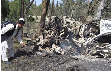 An unidentified man looks through the wreckage of a vehicle used by a suicide bomber following attacks on government buildings in Khost province east of Kabul, Afghanistan. (AP)