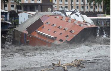 A collapsed six-storey hotel building is seen in heavily flooded river after Typhoon Morakot hit Taitung county, eastern Taiwan on Sunday. The building collapsed and plunged into a river after floodwaters eroded its base, but all 300 people in the hotel were evacuated and uninjured, officials said. (AP)
