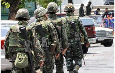 Soldiers patrol near the Government House in Bangkok, Thailand on Tuesday. Violent anti-government protests in the past recent weeks have forced the Thai government to impose a state of emergency in Bangkok and cancel a summit of Southeast Asian leaders. (AFP)