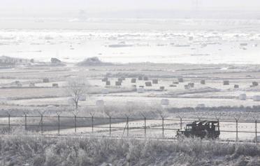 Soldiers in a truck patrol along a fence and a frozen river near the demilitarised zone separating the two Koreas in Paju, about 52 km north of Seoul. Relations between the two Koreas have chilled sharply since conservative President Lee Myung-bak took office early last year with a promise to end the free-flow of aid to the North unless it moved to end its nuclear weapons programme. (REUTERS)