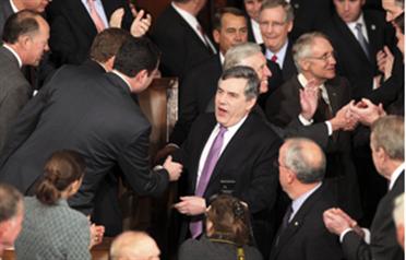 British Prime Minister Gordon Brown shakes hands as he arrives to address a joint session of Congress on Capitol Hill in Washington. (AP)