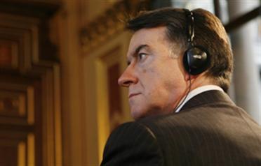 Secretary of State for Business, Enterprise & Regulatory Reform Lord Peter Mandelson listens during a press conference held by British Prime Minister Gordon Brown inside the Foreign Office .(Getty Image)