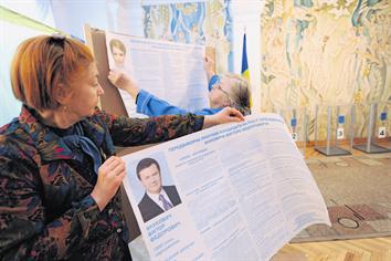 Election officials putting up posters of Ukraine's presidential candidates at a polling station in Kiev yesterday. (AP)
