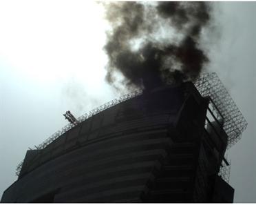 A close-up of the tower shows that soot and smoke have blackened glass panels down the front of the building.