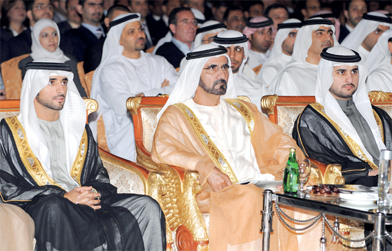 Sheikh Mohammed, Sheikh Hamdan and Sheikh Maktoum at the awards ceremony in Dubai yesterday. (WAM)