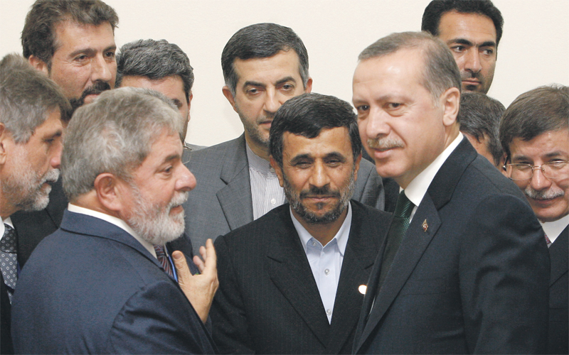 Iranian President Mahmoud Ahmadinejad flanked by his Brazilian counterpart Luis Inacio Lula da Silva, left, and Turkish Prime Minister Recep Tayyip Erdogan before signing an agreement in a nuclear fuel swap deal in Tehran. (AP)
