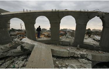 A Palestinian man stands in the window frames of a destroyed mosque on January 20, 2009 in the southern part of Gaza City, Gaza (GETTY IMAGES)