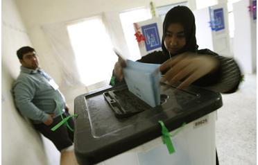 An Iraqi woman drops her ballot into the voting box as she takes part in the provincial elections on Saturday, in Baghdad's Sadr City district. Voting in Iraq's provincial elections began amid tight security in the nation's first ballot since 2005. (AFP)