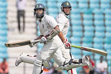 Hashim Amla, left, and Jacques Kallis running between the wickets during the first day of the Test match. (AP)