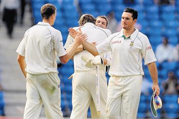 Fast bowler Dale Steyn (3-57) and left-arm spinner Paul Harris (3-76) shared six wickets to bowl out India for 319 in their follow-on at the Vidarbha Cricket Association stadium in Nagpur.