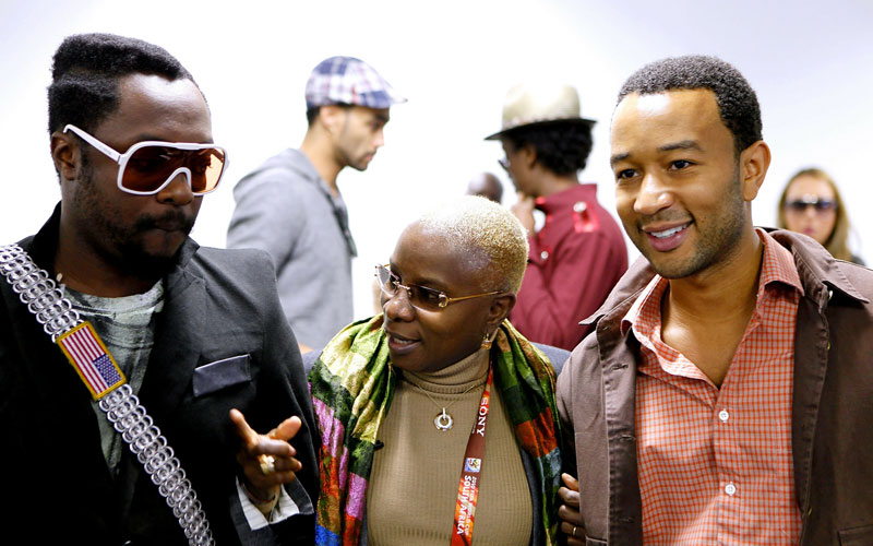 Will.I.Am (L) Angelique Kidjo (C) and John Legend (R) before taking to the pitch to address the media in preparation for FIFA World Cup Kick-off Celebration Concert Day 1 at Orlando Stadium on June 9, 2010 in Johannesburg, South Africa. (GETTY IMAGES)