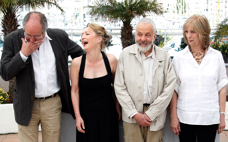 Director Mike Leigh (2nd R) poses with cast members (L-R) Jim Broadbent, Lesley Manville and Ruth Sheen during a photocall for the film "Another Year" in competition at the 63rd Cannes Film Festival May 15, 2010. Nineteen films compete for the prestigious Palme d'Or which will be awarded on May 23. (REUTERS)
