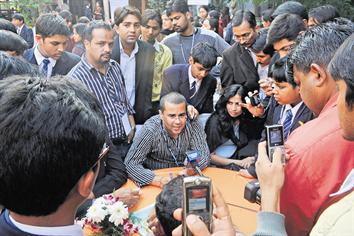 Indian author Chetan Bhagat talks to his fans and media at the Jaipur Literary Festival. (AFP)