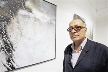 Kiarostami posing with one of his pictures in the background. His photography has been influenced by the 1979 Islamic revolution in Iran. (OSAMA ABUGHANIM)