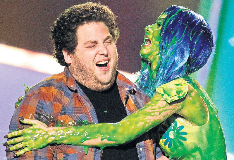 Singer Katy Perry hugs actor Jonah Hill after she was slimed at the Nickelodeon Kids' Choice Awards in Los Angeles. (REUTERS)