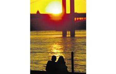 A couple sits on the Rhine River Promenade and enjoy the sunset in Dusseldorf. (GETTY IMAGES)